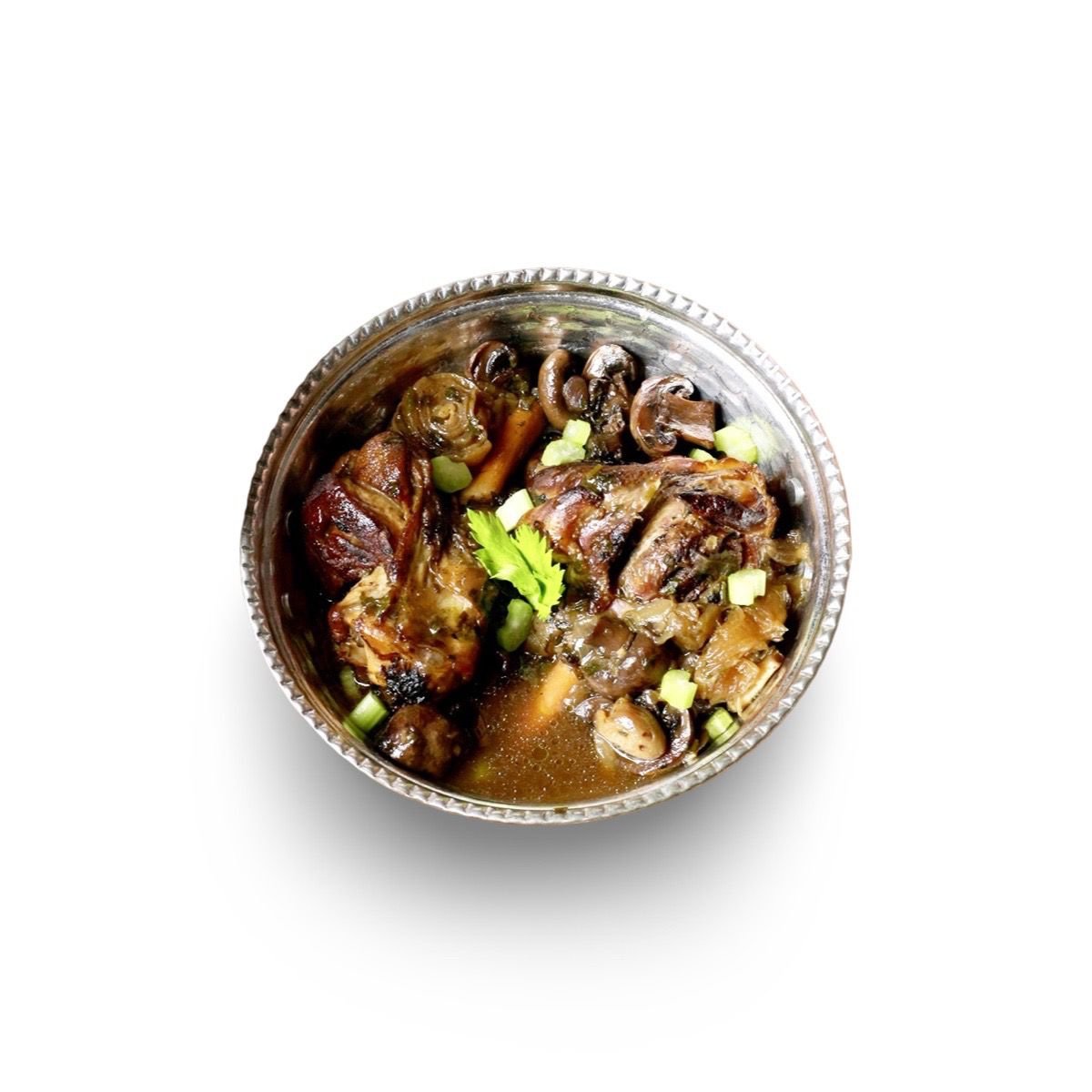 2 Slow cooked Lamb shanks, tender, succulent lamb shanks slow-cooked with vegtables stock to perfection, boasting rich flavors and fall-off-the-bone tenderness, ideal for a satisfying and comforting meal.
