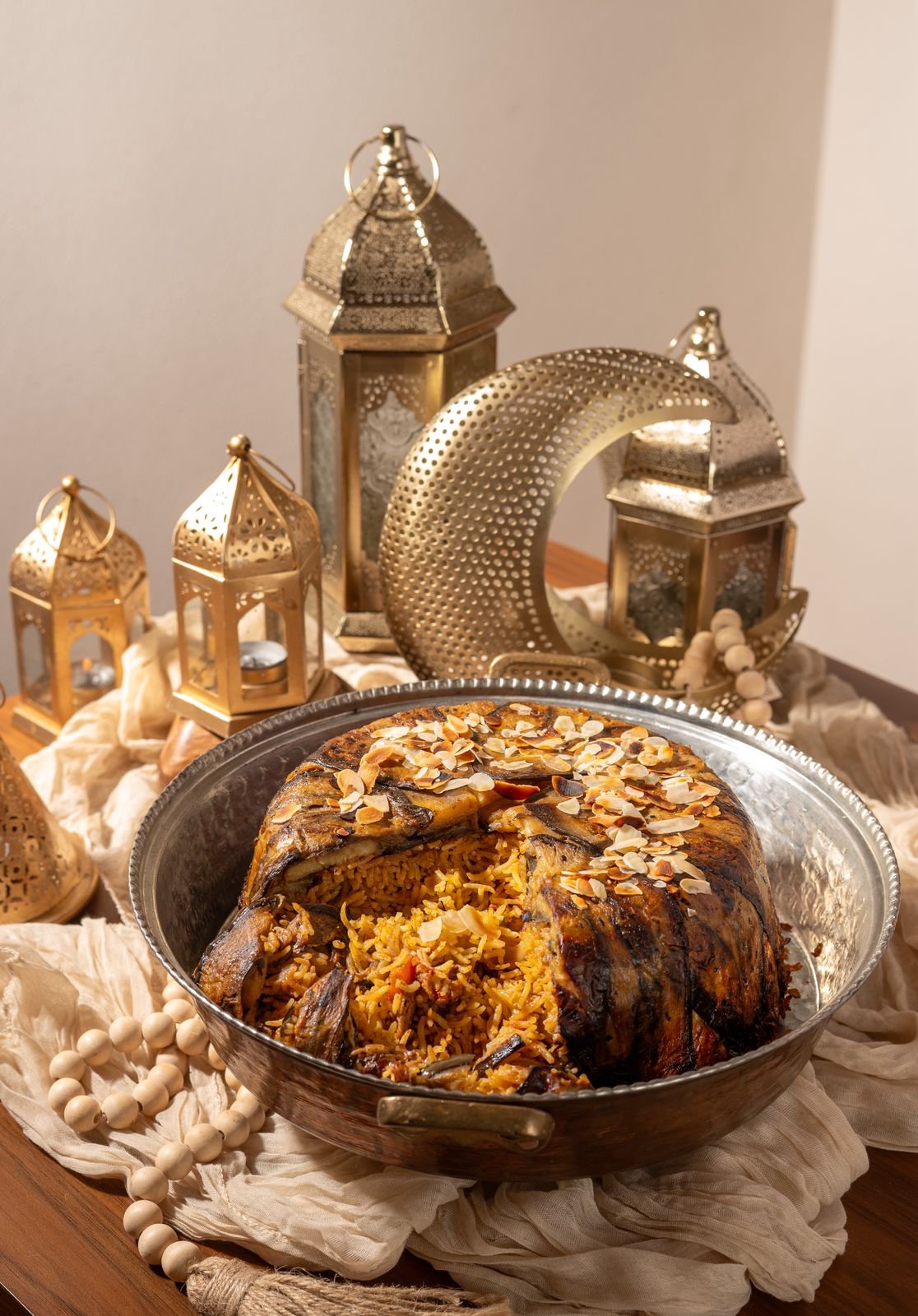 A traditional Middle Eastern layered rice dish made with tender spiced chicken, fragrant basmati rice, and slow-cooked vegetables. Flipped before serving, it reveals a beautifully stacked presentation infused with warm spices and rich, comforting flavors.