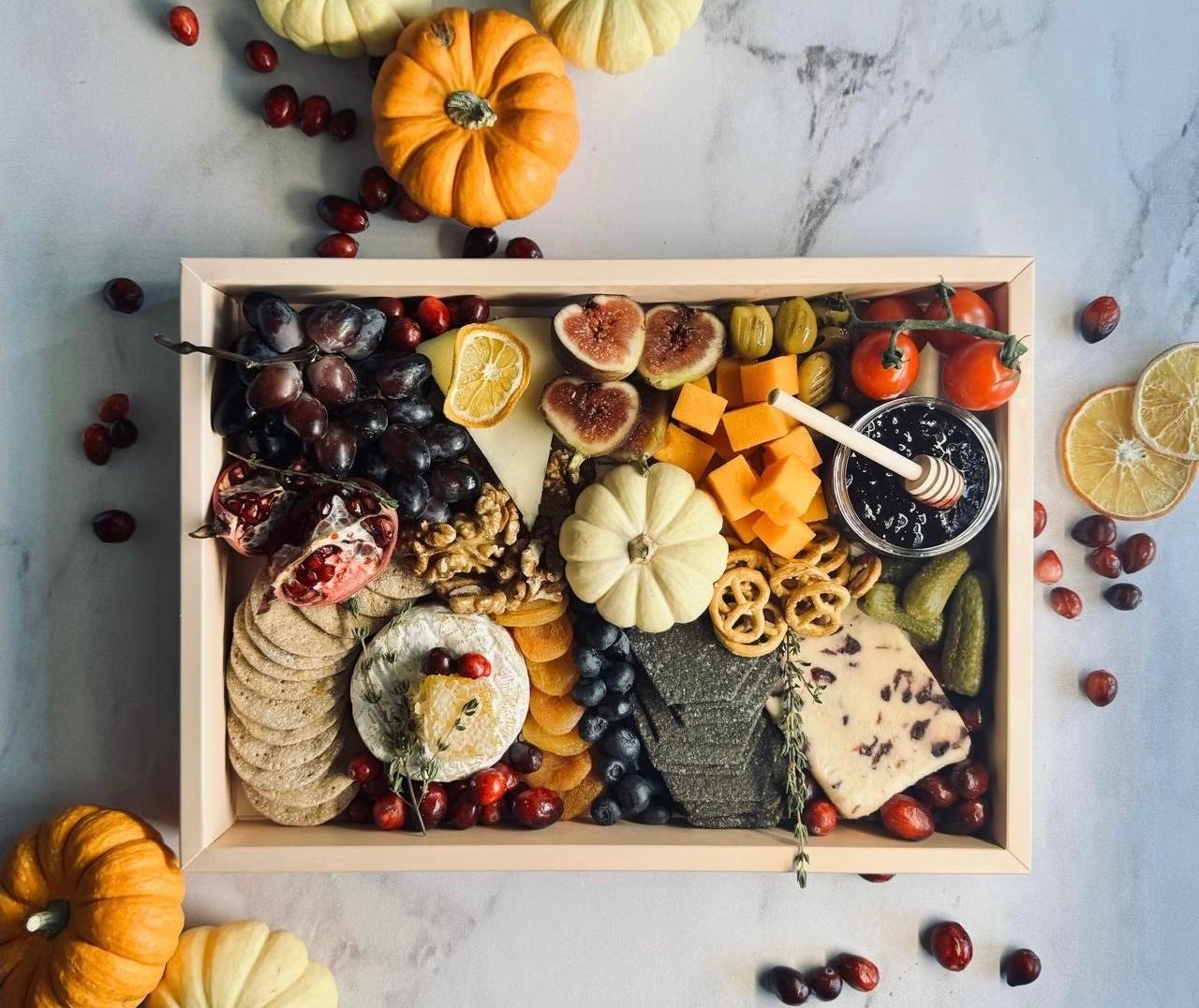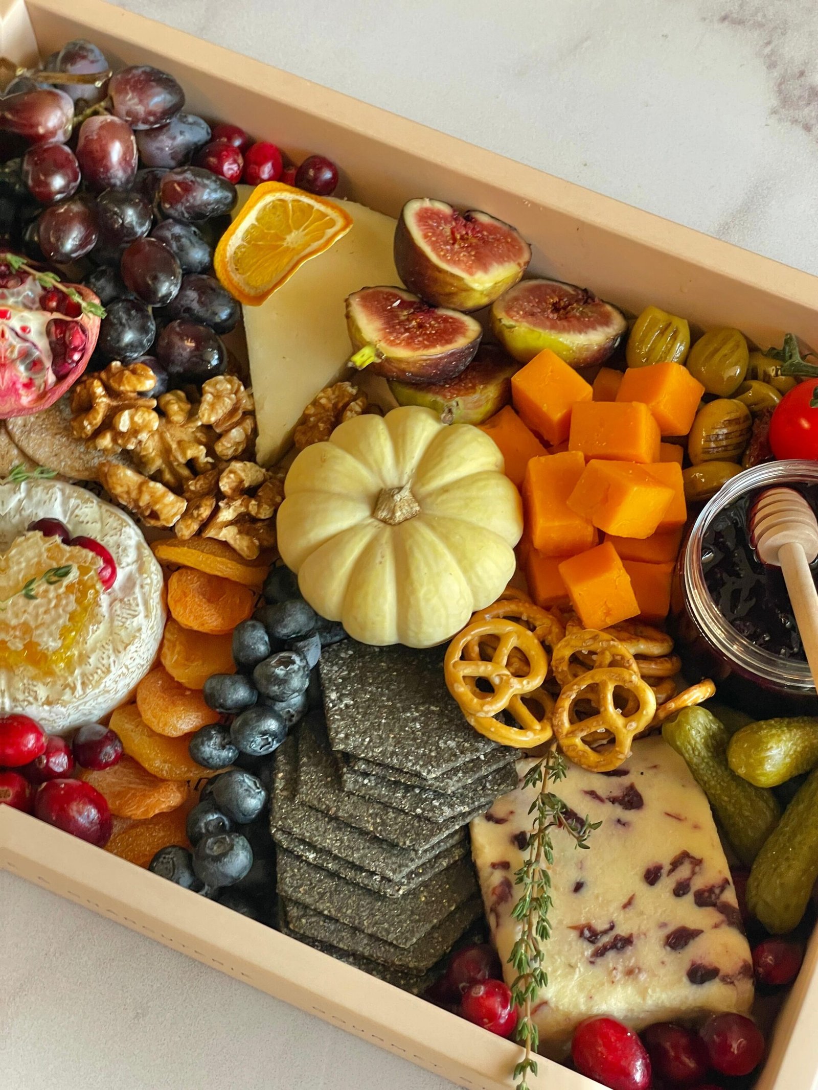 Celebrate the warmth of the season with our artisanal Christmas grazing board — a harvest-inspired feast featuring a rustic blend of cheeses, fruits, nuts, and fall flavors. Designed to capture the cozy spirit of autumn, this board pairs creamy, tangy, and sweet notes with a festive aesthetic — perfect for gatherings, picnics, or as a centerpiece for your holiday table.